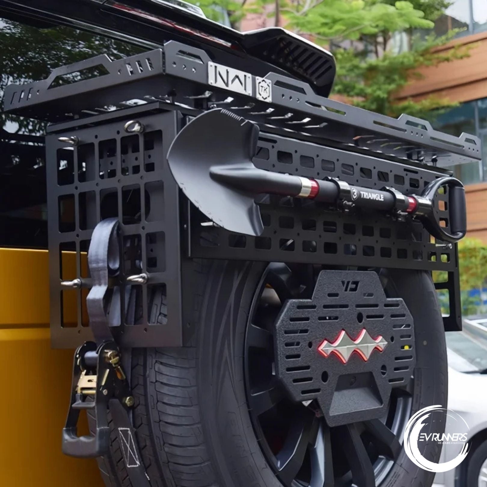The rack mounts securely to the spare tire using special binding straps, ensuring a firm, stable hold that stays steady through bumps, mud, and rocky terrain. Its engineer shovel mount allows for quick and easy installation, keeping your essential off-road tools within reach at all times.